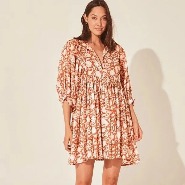 Vestido curto. Com mangas bufantes. Decote em V. Modelagem mais soltinha. Estampado. Cores: Amarelo, azul, azul marinho, marrom, preto e vermelho. Material: Poliéster.  TABELA DE MEDIDAS Siga estritamente a tabela de tamanhos para selecionar o tamanho desejado. Não selecione diretamente de acordo com os seus hábitos de uso. P: Busto:...